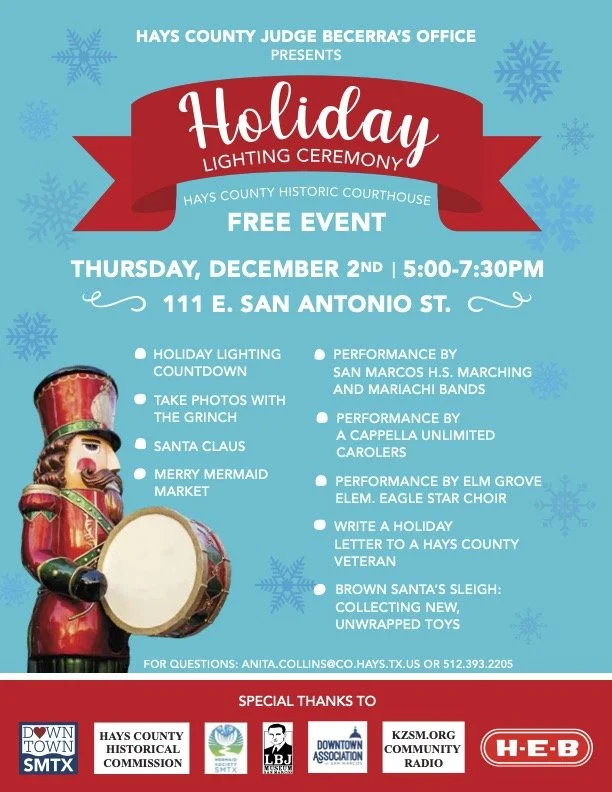 The 2021 Holiday Lighting Ceremony will take place from 5:00PM - 7:30PM at the Historic Hays County Courthouse.